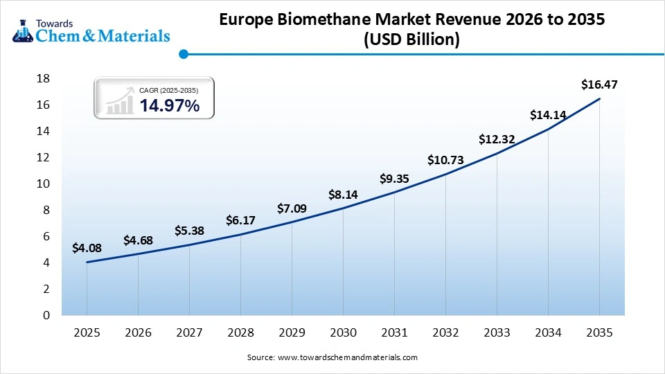 The Europe biomethane market size was estimated at USD 4.08 billion in 2025 and is projected to reach USD 16.47 billion by 2035, growing at a CAGR of 14.97% from 2026 to 2035