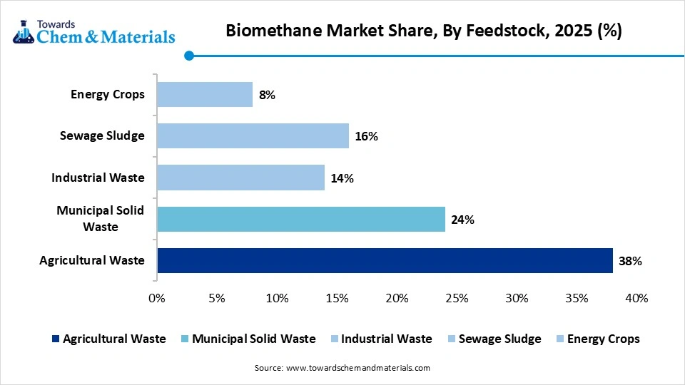 - By feedstock, the agriculture segment dominated the market with 38% share in 2025 and is expected to have the fastest growth with a CAGR of 15.20% in the forecast period.