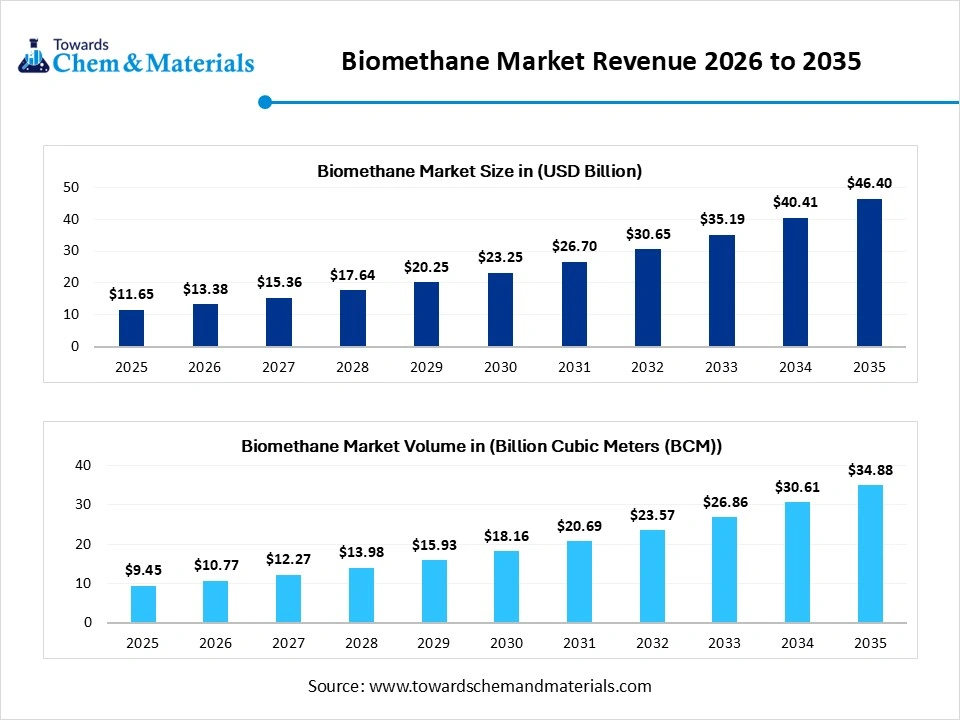 Ottawa, April 24, 2026 (GLOBE NEWSWIRE) -- The global biomethane market was valued at USD 11.65 billion in 2025, is estimated to reach USD 13.38 billion in 2026, and is projected to reach USD 46.40 billion by 2035, growing at a CAGR of 14.82% from 2026 to 2035. In terms of volume, the biomethane market is projected to grow from 9.45 million tons in 2025 to 34.88 million tons by 2035. growing at a CAGR of 13.95% from 2026 to 2035. Europe dominated the biomethane market with the largest revenue share of 35% in 2025. Incorporation of stricter government regulations, focus on sorting exceeding municipal waste & a pivotal aim at decarbonization, drives the global market growth. A study published by Towards Chemical and Materials a sister firm of Precedence Research.