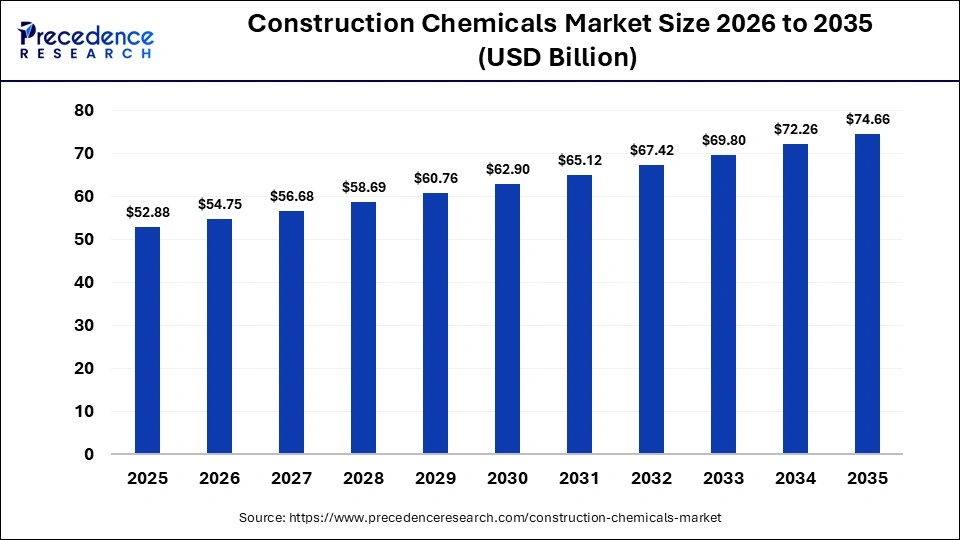 The global construction chemicals market size is valued at USD 54.75 billion in 2026 and is expected to be worth USD 74.66 billion by 2035, with a robust CAGR of 3.51% from 2026 to 2035. The construction chemicals market growth is driven by rising urbanization, infrastructure investments, & demand for durable, sustainable construction materials.