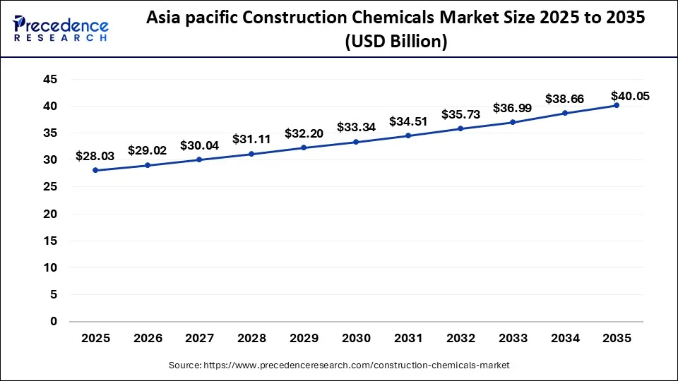 According to Precedence Research, the Asia Pacific construction chemicals market size is valued at USD 29.02 billion in 2026 and is predicted to reach around USD 74.66 billion by 2035, growing at a significant CAGR of 3.51% from 2026 to 2035.